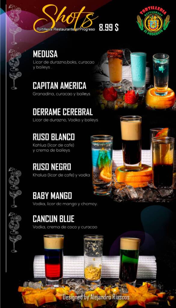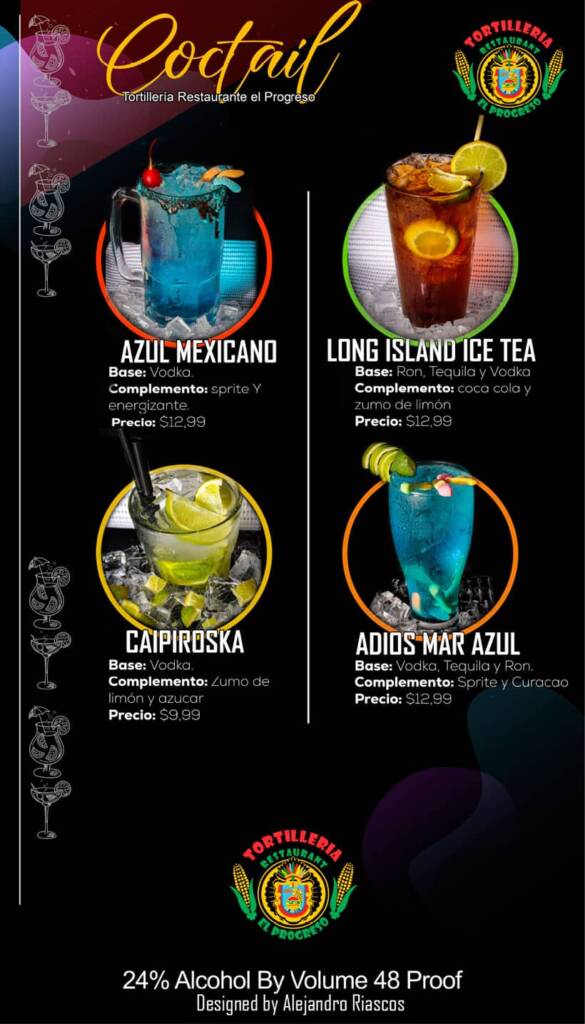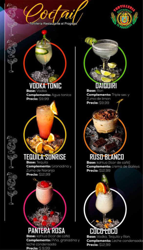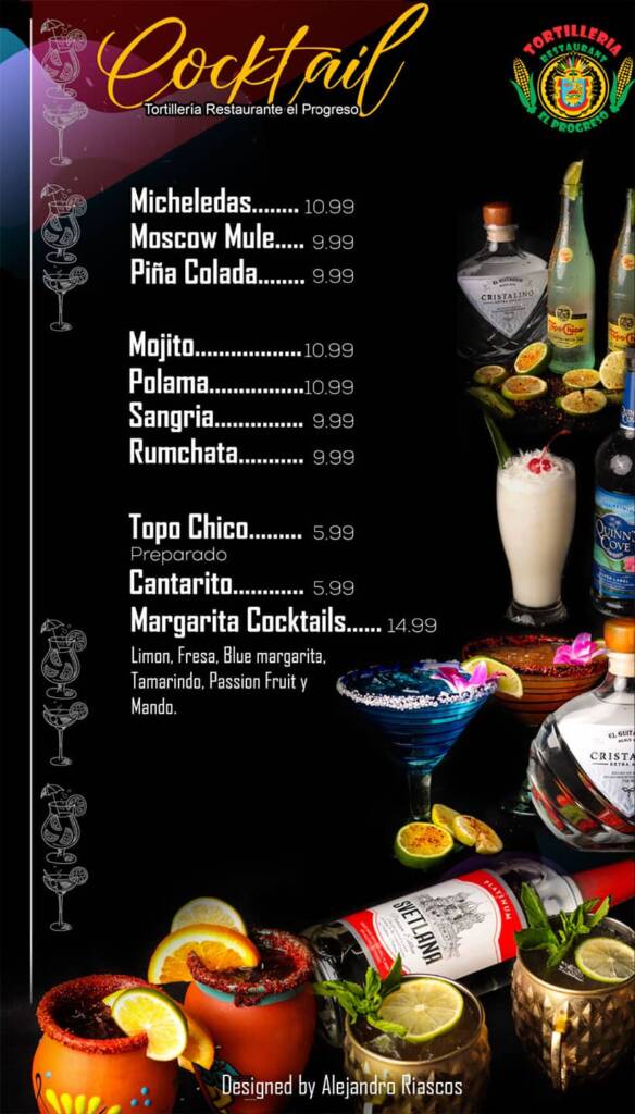 Bar Menu Navigate through the sections by clicking on the titles. Vodka Tonic, Daiquiri, Tequila Sunrise Ruso Blanco, Pantera Rosa, Coco Loco Azul Mexicano, Long Island Ice Tea, Caipiroska, Adios Mar Azul Micheladas, Moscow Mule, Piña Colada, Mojito, Polama, Sangria Rumchata, Topo Chico, Cantarito, Margarita Cocktails Shots Cocktail . Cocktail Shots Other Menu availableFood Menu