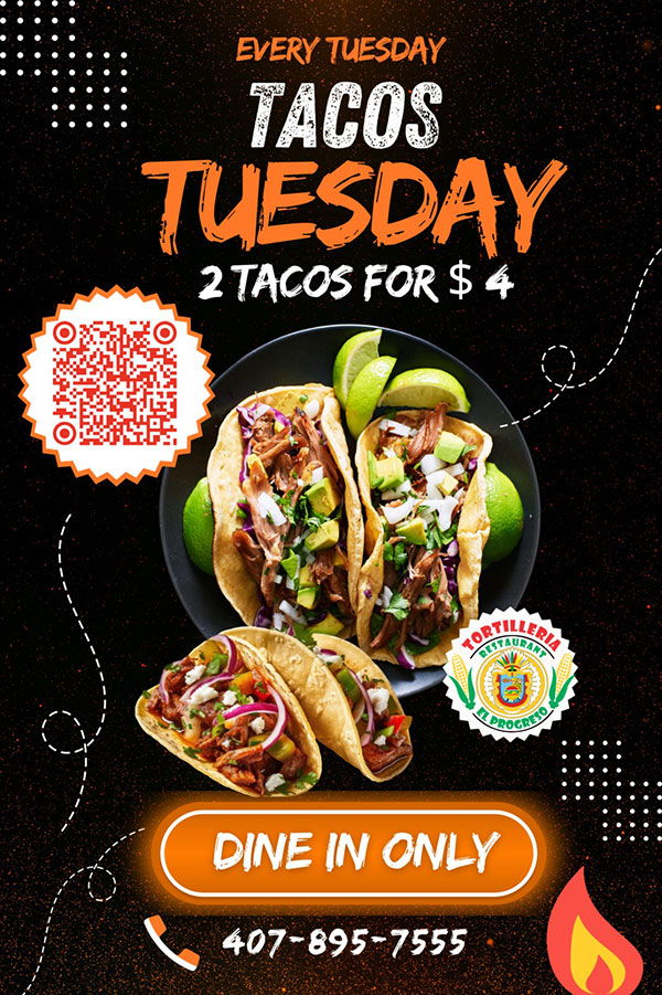At Tortilleria Restaurant El Progreso we spoil you with an irresistible offer: 2 tacos for $4. Come and enjoy the Mexican tradition that makes every Tuesday special!